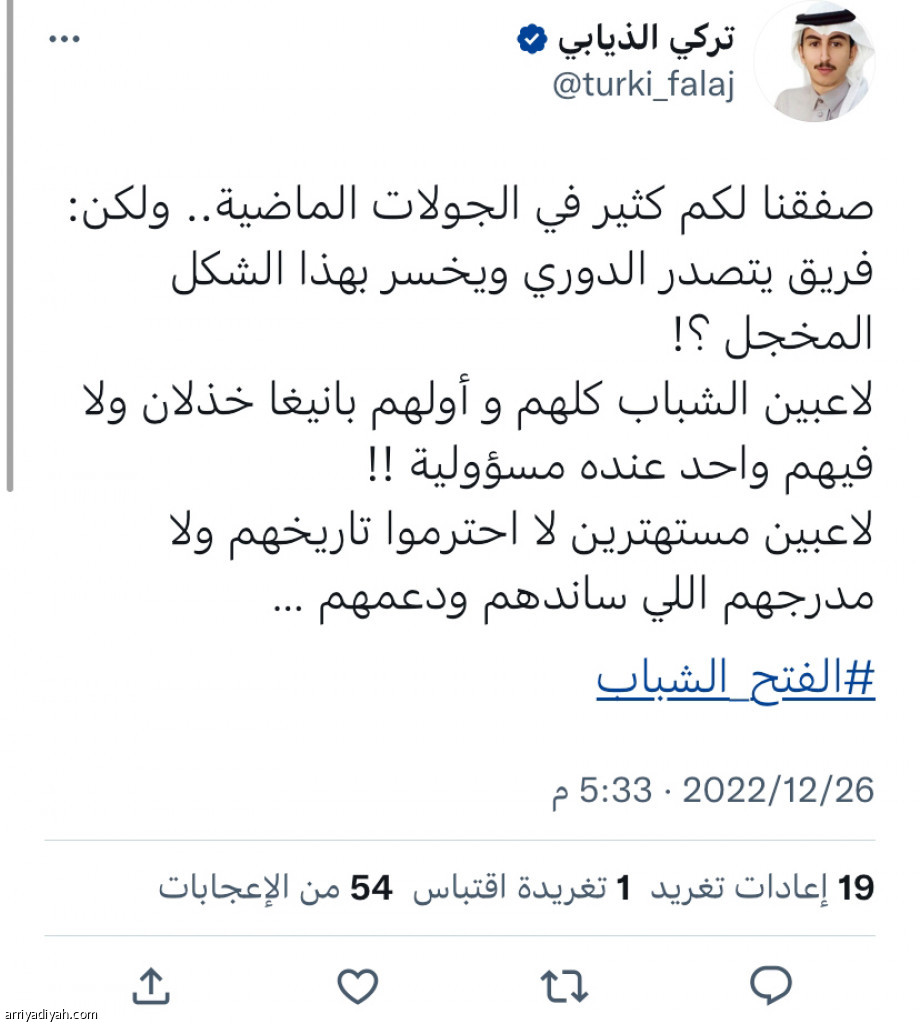 عبّر مشجعو فريق الشباب الأول لكرة القدم عن استيائهم من مستويات “الليث”، بعد فترة توقف كأس العالم 2022، وخسارتهم أمام فريق الفتح 4ـ1، أمس، ضمن مباريات الجولة الـ 10 من دوري روشن السعودي. وجاءت غالبية التغريدات منتقدة مستوى الشباب، ومن بينهم الإعلامي تركي الذيابي، قائلًا: “صفقنا لكم كثيرًا في الجولات الماضية.. ولكن فريق يتصدر ويخسر بهذا الشكل المخجل؟!”، مضيفًا: “لاعبو الشباب كلهم، وأولهم بانيجا، خذلان، ولا فيهم واحد عنده مسؤولية”. وحمّل بعض مغردي الشباب الخسارة على التحكيم، بوصفهم ركلة الجزاء، التي سجل منها الهدف الأول، بغير الصحيحة، ومنهم صالح الذي أضاف مقطع فيديو من الحالة الجدلية، وقال: “فريقي غير جيد، لكن هل هذه ركلة جزاء؟ لا تعليق صراحة”.