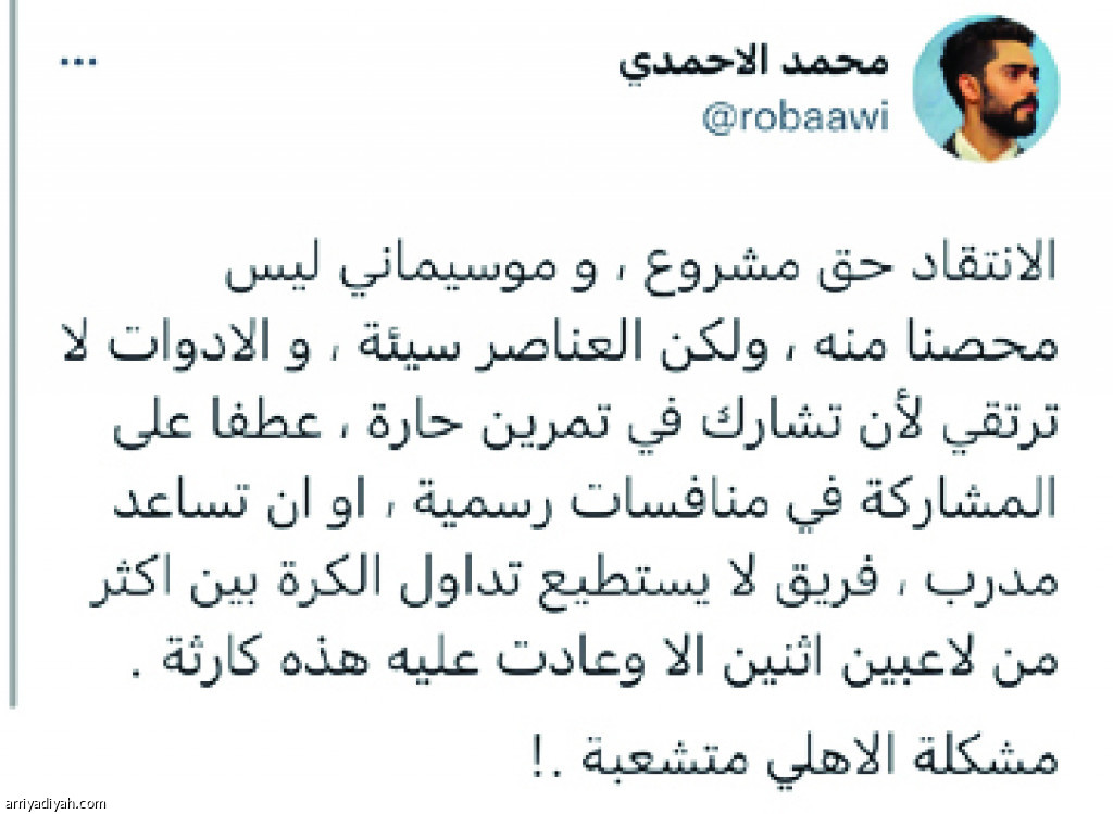 سيطر تعادل فريق الأهلي الأول لكرة القدم مع نظيره العربي سلبًا، أمس، على اهتمامات مستخدمي موقع التدوينات القصيرة “تويتر”، حيث تصدر الترند السعودي بأكثر من عشرة آلاف تغريدة. وجاءت غالبية التغريدات من جماهير الأهلي مستاءةً من مستويات الفريق الجداوي، ومحملةً الجنوب إفريقي بيتسو موسيماني، مدرب الفريق، المسؤولية عن سوء النتائج، من بينهم عادل الذيابي الذي كتب: “موسيماني ماذا فعلت في الفترة الماضية؟”. مضيفًا: “بناء الهجمة معدوم، وإخراج الكرة معدوم”. بينما خالفه محمد الأحمدي قائلًا: “الانتقاد حق مشروع، وموسيماني ليس محصنًا منه، ولكن العناصر سيئة، والأدوات لا ترتقي لأن تشارك في تمرين حارة”.
