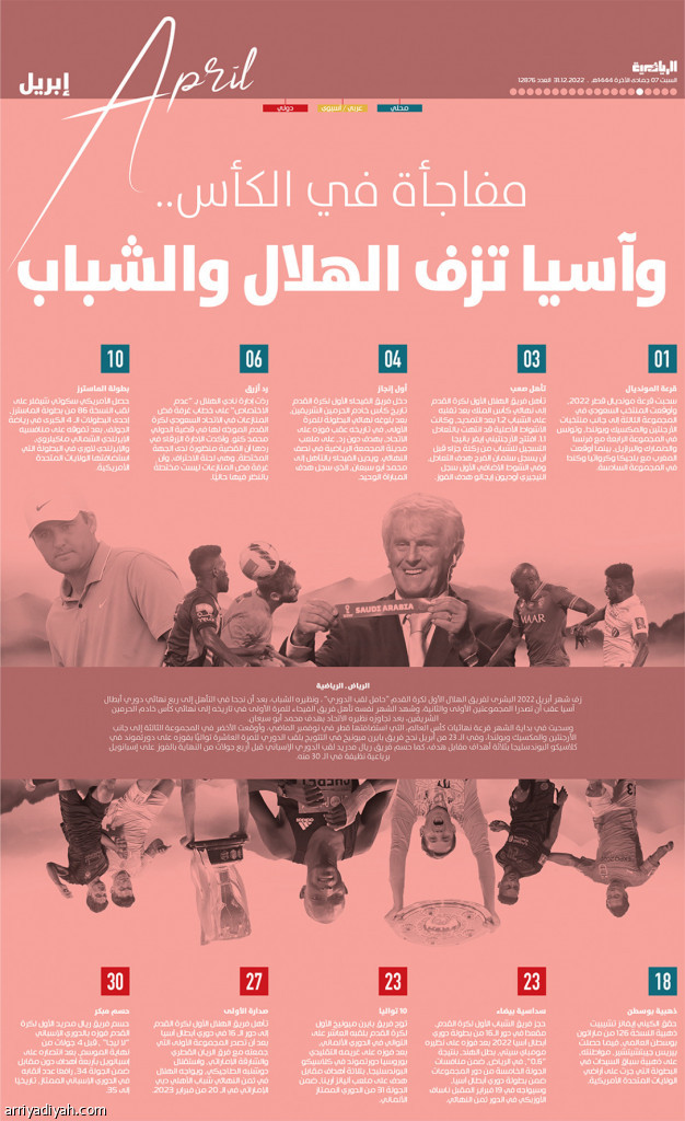 زف شهر أبريل 2022 البشرى لفريق الهلال الأول لكرة القدم “حامل لقب الدوري” ، ونظيره الشباب، بعد أن نجحا في التأهل إلى ربع نهائي دوري أبطال آسيا عقب أن تصدرا المجموعتين الأولى والثانية، وشهد الشهر نفسه تأهل فريق الفيحاء للمرة الأولى في تاريخه إلى نهائي كأس خادم الحرمين الشريفين، بعد تجاوزه نظيره الاتحاد بهدف محمد أبو سبعان.
