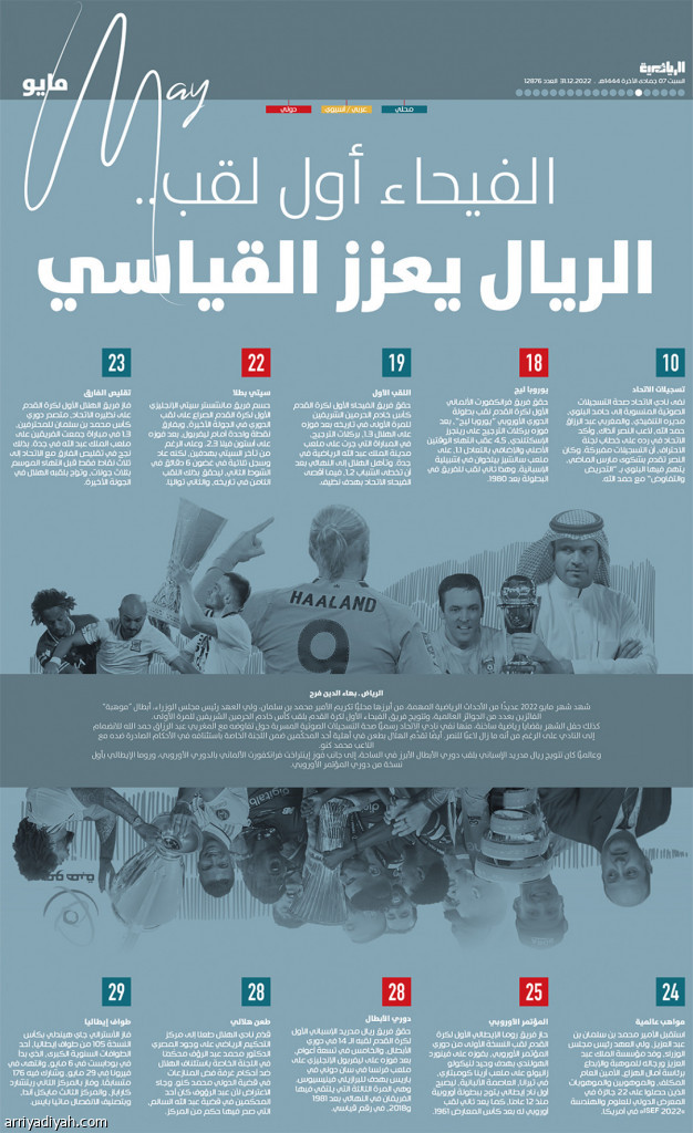 شهد شهر مايو 2022 عديدًا من الأحداث الرياضية المهمة، من أبرزها محليًّا تكريم الأمير محمد بن سلمان، ولي العهد رئيس مجلس الوزراء، أبطال “موهبة” الفائزين بعدد من الجوائز العالمية، وتتويج فريق الفيحاء الأول لكرة القدم بلقب كأس خادم الحرمين الشريفين للمرة الأولى.