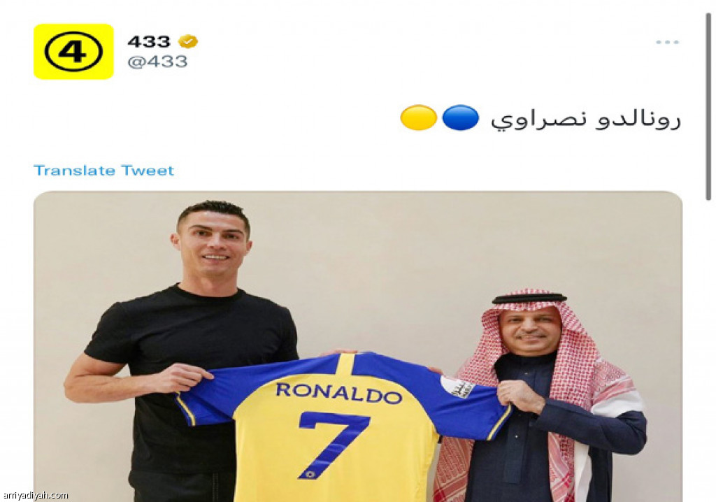 نشر الحساب الرياضي الشهير “433”، الذي يختصُّ بالأخبار الرياضية العالمية، ويتابعه نحو ثلاثة ملايين في منصة “تويتر”، تغريدة بعد إعلان نادي النصر التعاقد مع كريستيانو رونالدو قائلًا: “رونالدو نصراوي”.