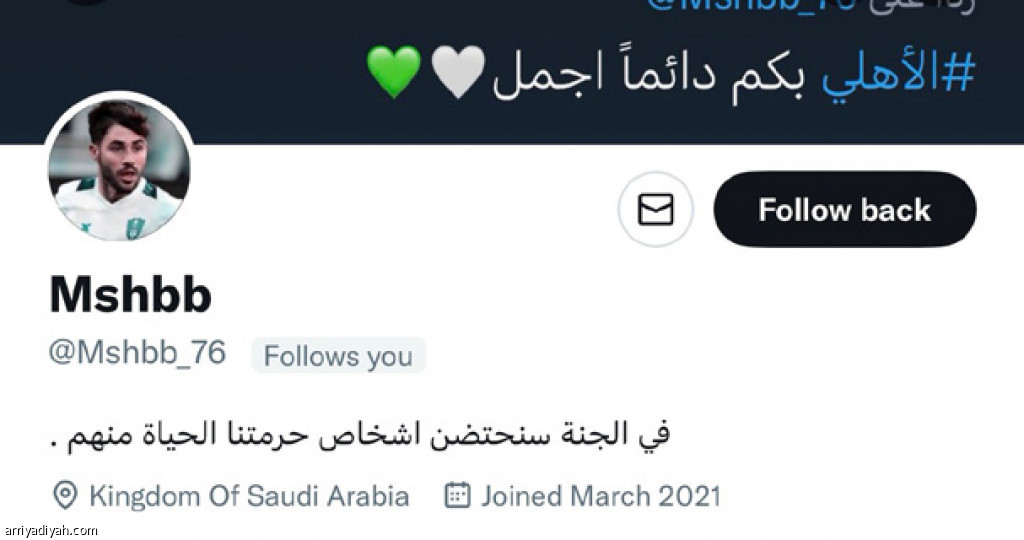 يعدُّ المغرد “مشبب”، الذي يتابعه نحو 10 آلاف في منصة “تويتر”، أحد المهتمين برياضة كرة القدم، وبفريقه المفضَّل الأهلي.. وفي حواره مع “الرياضية”، كشف “مشبب” عن توقعاته لموسم الأهلي، وتحدث عن صفقة البرتغالي كريستيانو رونالدو.