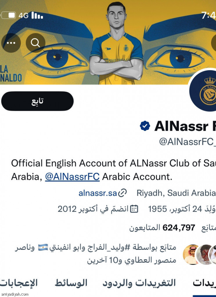 ازداد عدد متابعي نادي النصر الرسمي على منصة “تويتر”، الناطق باللغة الإنجليزية، بنحو 96 ألفًا، بعدما شارك البرتغالي كريستيانو رونالدو، أسطورة كرة القدم، مهاجم فريق النصر الأول لكرة القدم، بإعادة التغريد. وواصل حسابا النصر على منصتي “تيك توك”، و”إنستجرام”، تسجيل الأرقام القياسية بعد التعاقد مع الأسطورة البرتغالية، السبت الماضي، بصفقة انتقال حر، وعقد يمتد إلى موسمين ونصف الموسم، ووصل عدد متابعي الأصفر على “إنستجرام” إلى 6.6 مليون متابع، فيما أحرز على منصة “تيك توك” 2.5 مليون متابع.