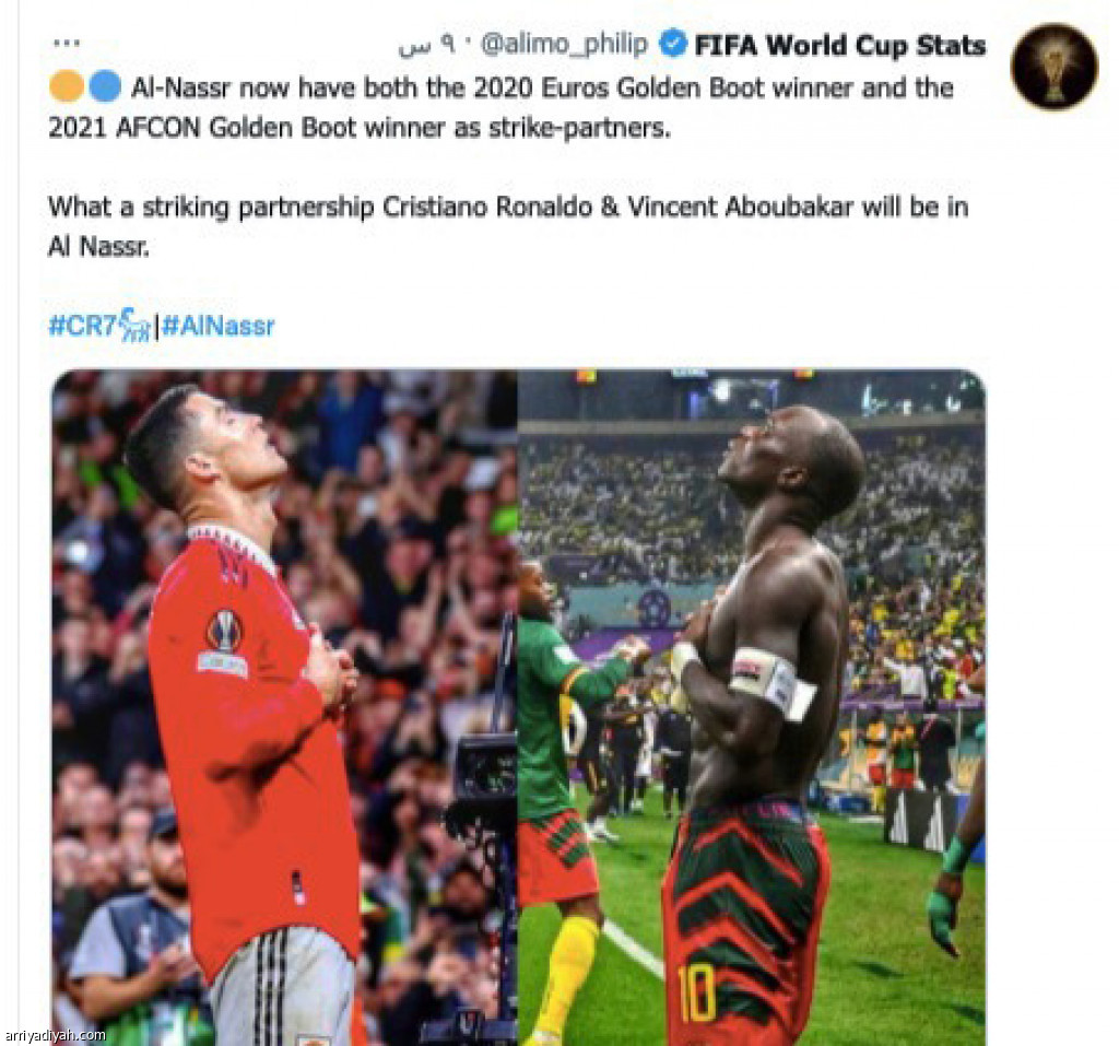 كثير من المغردين الأوروبيين تفاعلوا مع حساب النصر باللغة الإنجليزية، متسائلين عن طريقة مشاهدة مباريات رونالدو المقبلة، مثل كافورت، الذي خاطب الحساب: “من فضلك كيف نشاهده يلعب”، مضيفًا: “يرجى إعطاء حقوق البث التلفزيوني للمحطات التي يمكنها نشر جميع مبارياته، أو قم بإسقاط الرابط، حيث يمكننا دائمًا بث مبارياته”، وعلى النهج ذاته، كتب ميشيل باركي: “في أي مكان تلعب فيه كرة القدم، سأشاهد مباريات الدوري بقدر ما أستطيع. محب لكريستيانو حتى أموت”، وأضاف مخاطبًا الدون: “جعلتني أحب اللعبة المسماة كرة القدم، ولن أنسى ذلك أبدًا، مثلي الأعلى”، من جانب آخر، طالبت ريتا لاعبي النصر بالاعتناء به، وكتبت: “اعتنوا به جيدًا، فنحن بحاجة إليه بشدة في عام 2026”، وعلى النهج المتفائل ذاته، كتب حمد السعيد، مخاطبًا الدون: “في نادي النصر ستجد وتعرف وترى الحب الحقيقي كما لم تره من قبل”. من جانب آخر، تفاعل المغردون مع تغريدة حساب كأس العالم، التابع للاتحاد الدولي لكرة القدم، التي وضع فيها صورة رونالدو مع الكاميروني فينسنت أبو بكر، وعلق عليها: ”لدى النصر الآن كل من الفائز بجائزة الحذاء الذهبي لليورو 2020، والفائز بالحذاء الذهبي في كأس الأمم الإفريقية 2021، كشريكين”، مضيفًا: ”يا لها من شراكة مدهشة، سيكون كريستيانو رونالدو وفينسنت أبو بكر في النصر”. أكثر من 200 ألف مغرد تفاعلوا مع الصورة خلال أول ساعتين من نشرها، ومنهم علي السلال، الذي كتب: ”كم أنت كبير يا النصر العالمي”، ومثله كتب يوسف جويني: ”ملك كرة القدم قد جاء بالفعل؟ لا أصدق، إنني في حلم”، وعلى نهجهما سار الكثير من المغردين النصراويين.
