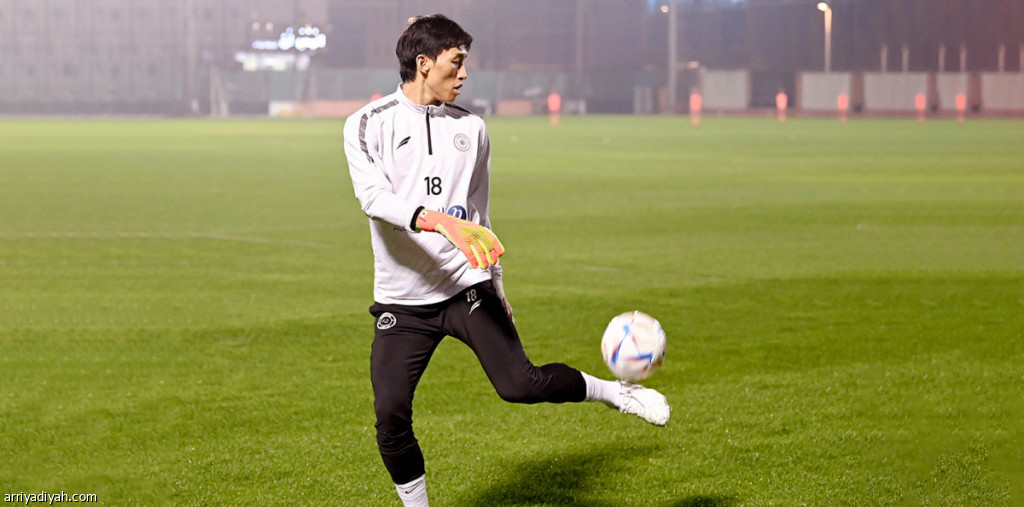 صورة التقطت أمس للكوري الجنوبي كيم، حارس مرمى الشباب، يؤدي فاصلًا مهاريًا بالكرة قبل انطلاق التدريبات (المركز الإعلامي ـ الشباب)