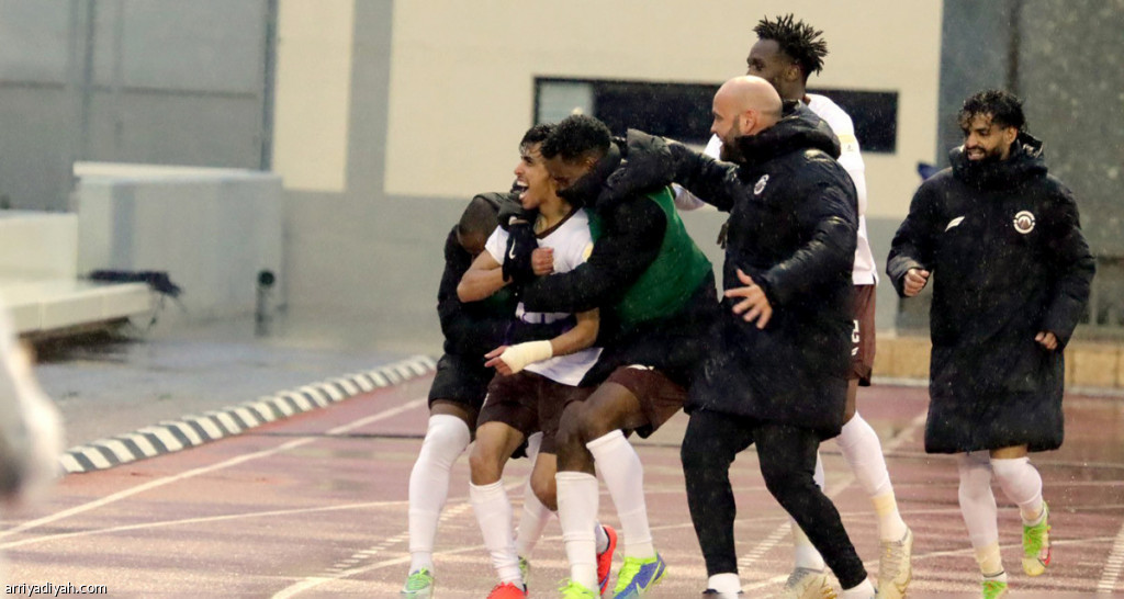 صورة التقطت أمس لبندر العنزي، لاعب وسط فريق الجبلين، يحتفل مع زملائه بتسجيله الهدف الثالث(المركز الإعلامي ـ دوري يلو)