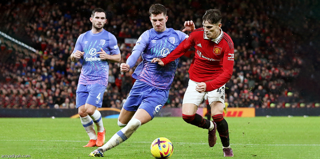 صورة التقطت أمس الأول لأليخاندرو جارناتشو لاعب فريق مانشستر يونايتد في صراع على الكرة مع كريس ميفام لاعب فريق بورنموث خلال لقاء الفريقين (الأوروربية)