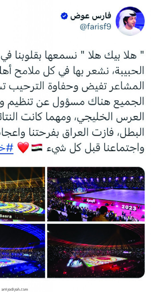تفاعل مستخدمو موقع التدوينات القصيرة “تويتر”، أمس، مع حفل افتتاح كأس الخليج 25، في محافظة البصرة العراقية على ملعب البصرة الدولي، واحتل هاشتاق كأس الخليج المرتبة السابعة في الترند السعودي بواقع 12.9 ألف تغريدة. وجاءت غالبية التغريدات مثنية على الجماهير العراقية وحفل الافتتاح، من بينهم نواف الآسيوي: “افتتاح بطولة خليجي في العراق.. راااااائع”، وعلى السياق ذاته علَّق المعلق الإماراتي فارس عوض على ترديد الجماهير العراقية جملة “هلا بيك هلا” قائلًا: “نسمعها بقلوبنا في العراق الحبيبة، ونشعر بها في كل ملامح أهلها الطيبين”، مضيفًا: “حفاوة الترحيب تشعرك أن الجميع مشارك في نجاح العرس الخليجي”.