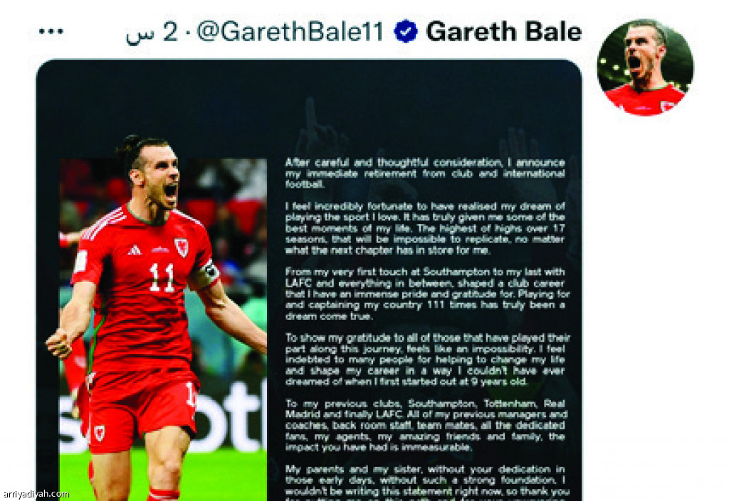 احتل الويلزي جاريث بيل، مهاجم منتخب بلاده السابق، المرتبة الأولى في الترند العالمي، بواقع 60 ألف تغريدة بعد ساعة من إعلان اعتزاله كرة القدم، عبر حسابه الرسمي على موقع الطائر الأزرق “تويتر”.