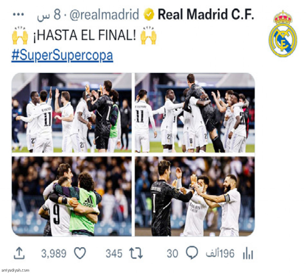 وبلغ عدد التفاعل مع وسم ريال مدريد أكثر من 50 ألفًا، جاءت غالبيتها مستاءة من مستوى الملكي، على الرغم من صعوده إلى نهائي كأس السوبر الإسباني، إذ انتقد خوان البرازيلي فينيسيوس جونيور، مهاجم الفريق، والإيطالي كارلو أنشيلوتي قائلًا: “فينيسيوس كان ضعيفًا للغاية، وكان على هازارد أن يأتي من الدقيقة 60، هي مباراة سيئة لفيني وأنشيلوتي كان عنيدًا جدًا”.
