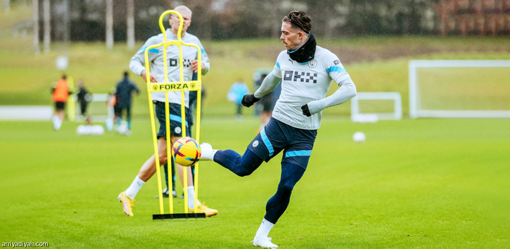 صورة التقطت أمس الأول للدولي الإنجليزي جاك جريليش مهاجم فريق مانشستر سيتي الأول لكرة القدم يتحكم بالكرة خلال الحصة التدريبية تحضيرًا لمواجهة مانشستر يونايتد اليوم لحساب الجولة الـ 18 من الدوري الممتاز على ملعب أولد ترافورد (المركز الإعلامي- السيتي)