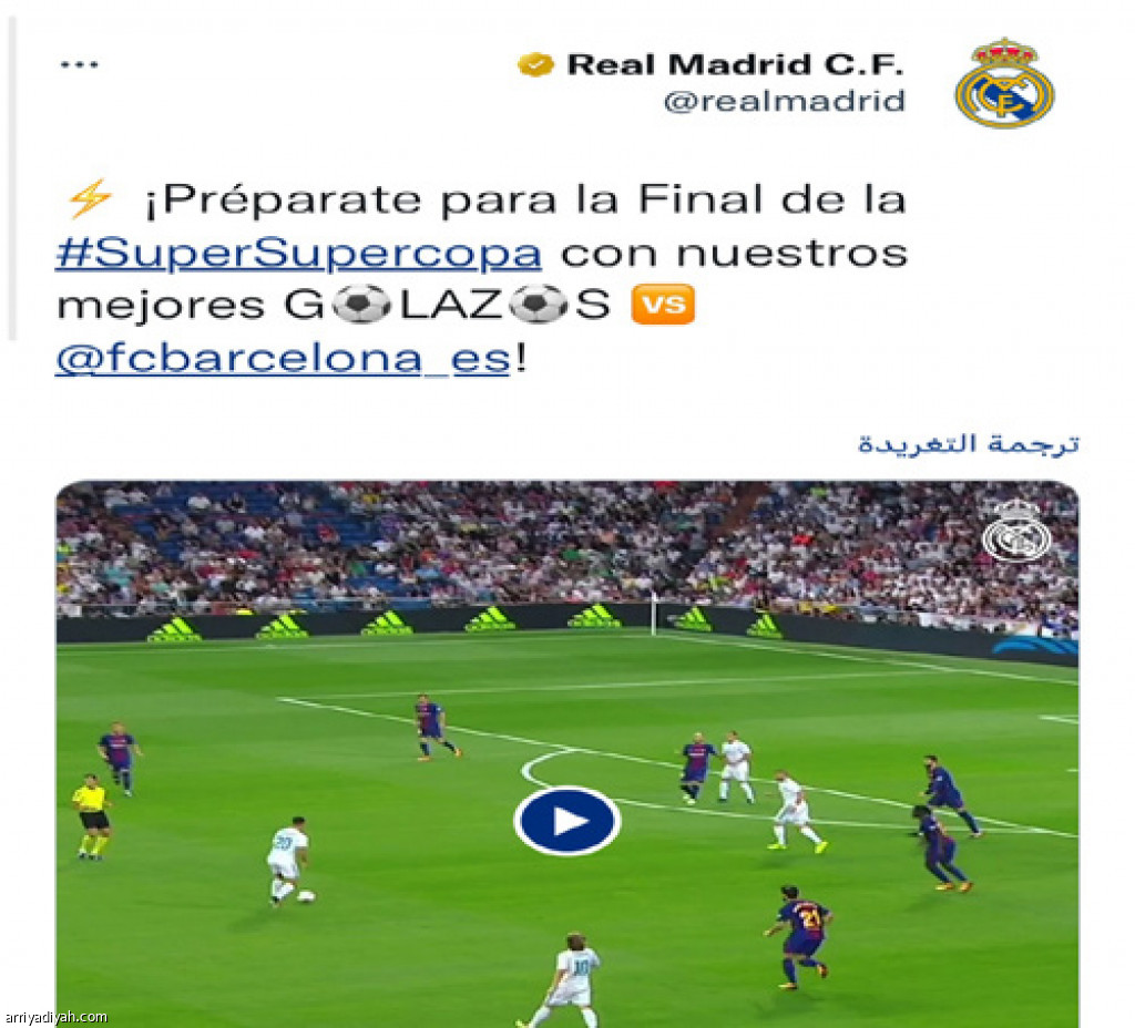 استذكر حساب ريال مدريد الإسباني الرسمي، عبر “تويتر”، أمس، مقطع فيديو لأهداف الريال في نهائي بطولة كأس السوبر الإسباني.