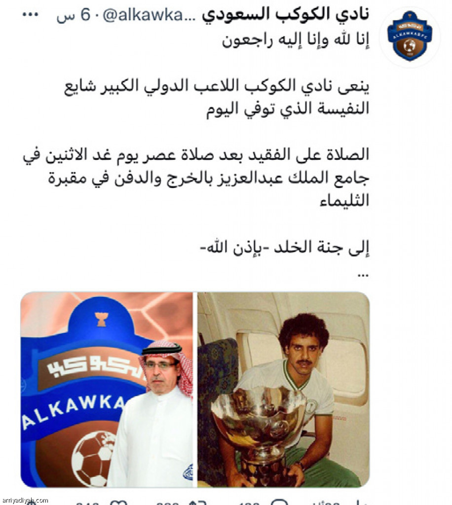تفاعل مستخدمو موقع التدوينات القصيرة “تويتر”، مع وفاة شايع النفيسة، نجم الكرة السعودية، إذ حل وسم #شايعالنفيسةفيذمةالله، ثالث الترند السعودي، بواقع 15.9 ألف تغريدة.
