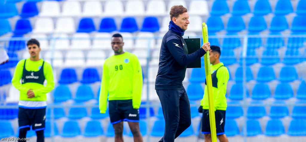 صورة التقطت أمس للكرواتي ألين هورفات، مدرب الباطن، يثبت أحد الحواجز تمهيدًا لاستخدامه في التدريبات (المركز الإعلامي ـ الباطن)