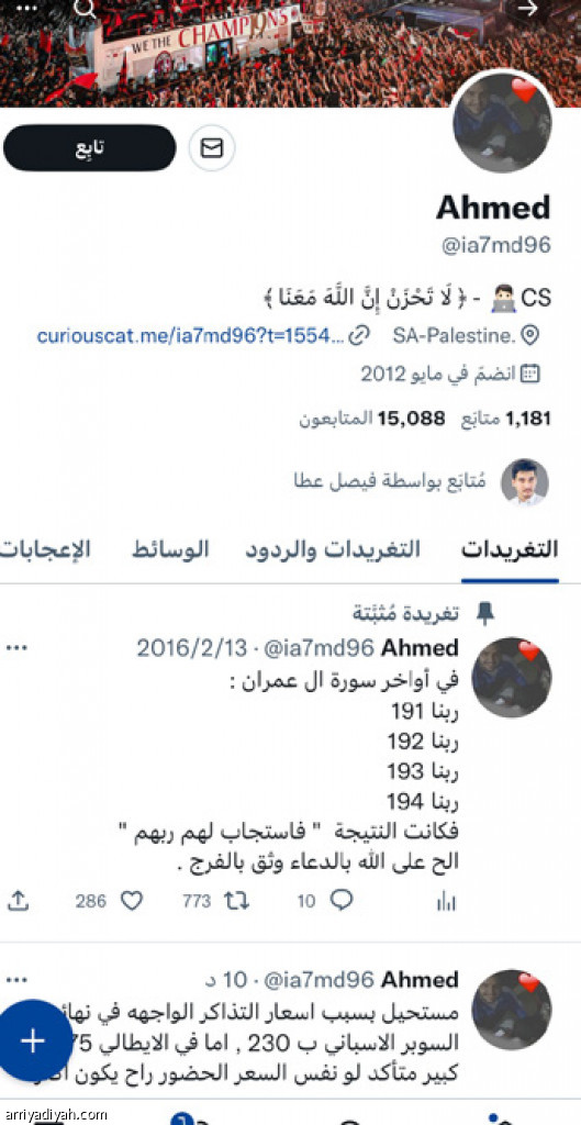 يعدُّ المغرد أحمد، الذي يحب ميلان ويتابعه نحو 15 ألفًا في منصة “تويتر”، أحد المهتمين برياضة كرة القدم.. وفي حواره لـ “الرياضية” تحدَّث أحمد عن مواجهة الإنتر وميلان، اليوم، في نهائي كأس السوبر الإيطالي.