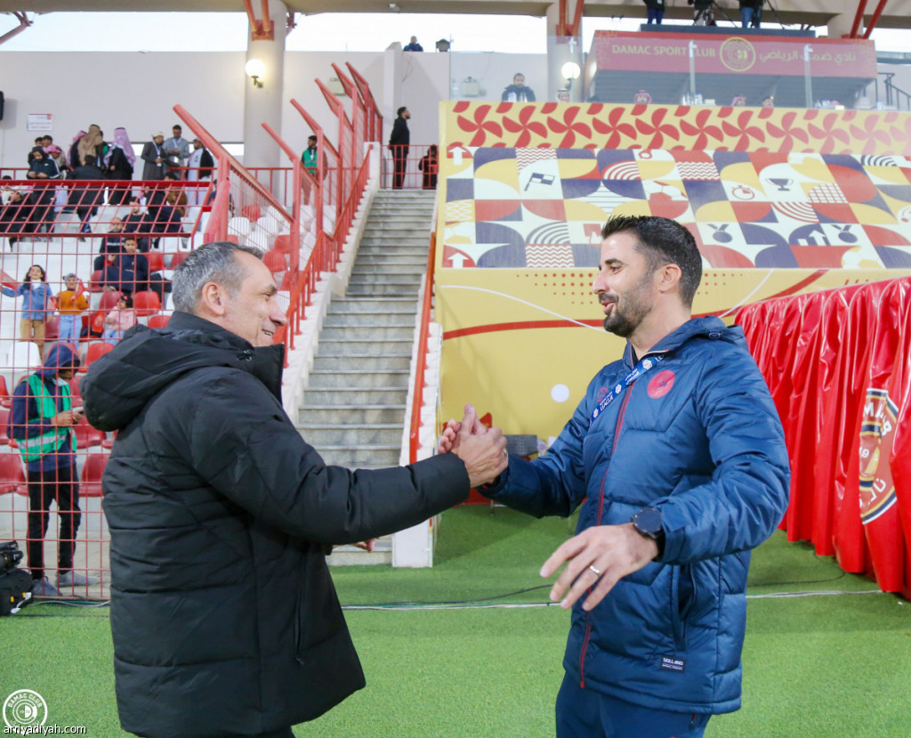 صورة التقطت أمس للكرواتي كريشمير ريزيتش، مدرب فريق ضمك الأول لكرة القدم، يصافح اليوناني جورجوس دونيس، مدرب الفتح، قبل لقاء الفريقين دوريًّا في خميس مشيط (المركز الإعلامي - ضمك)