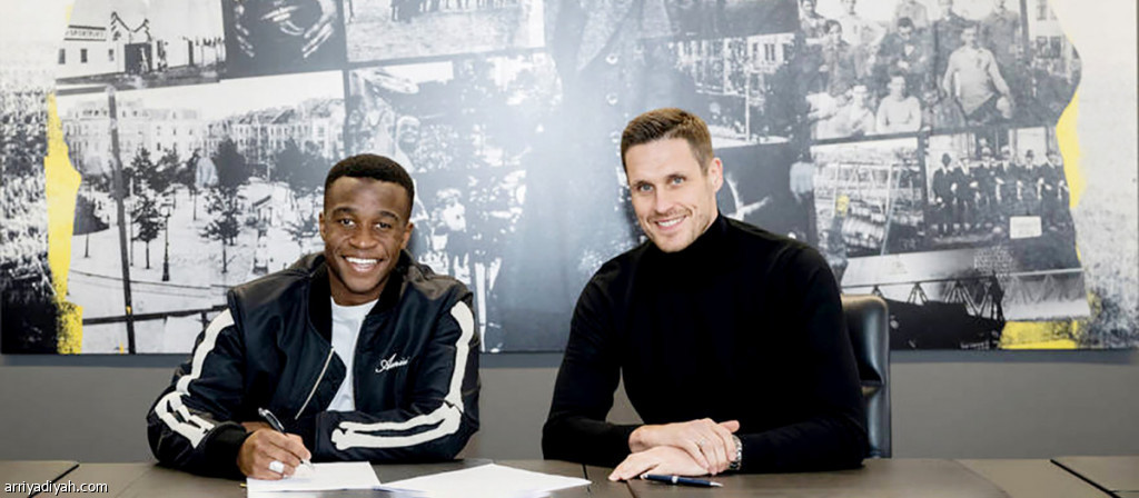 صورة التقطت أمس ليوسف موكوكو، مهاجم فريق بوروسيا دورتموند الألماني الأول لكرة القدم، أثناء التوقيع على تجديد عقده (المركز الإعلامي - بوروسيا دورتموند)
