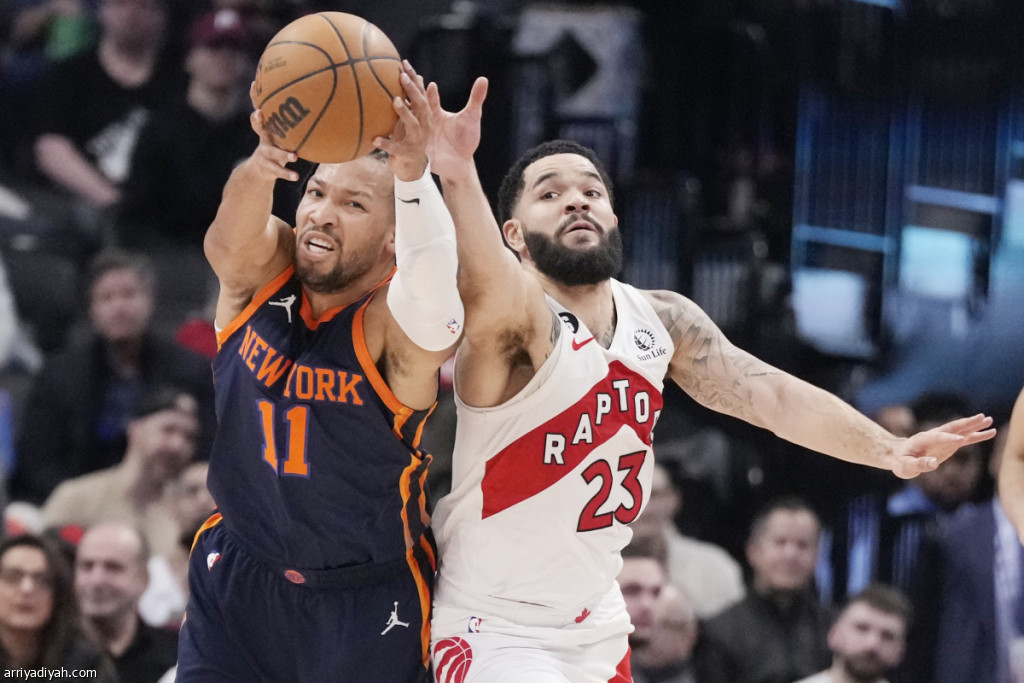 صورة التقطت أمس لفريد فان فليت، لاعب فريق تورونتو رابتورز الأول لكرة السلة، يتنافس على الكرة مع جالين برونسون، لاعب نيويورك نيكس(الأوروبية)