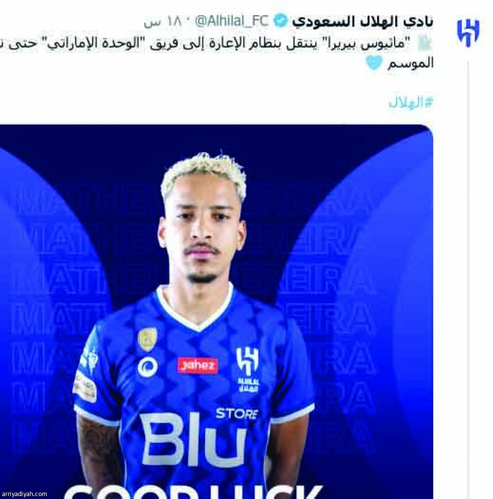 استحوذ إعلان نادي الهلال إعارة البرازيلي ماتيوس بيريرا، لاعب وسط الفريق الأول لكرة القدم، إلى نادي الوحدة الإماراتي على اهتمامات مستخدمي موقع التدوينات القصيرة “تويتر” في السعودية، بمعدل بلغ نحو 326 ألف تغريدة في الساعة الواحدة، منذ إعلانه.