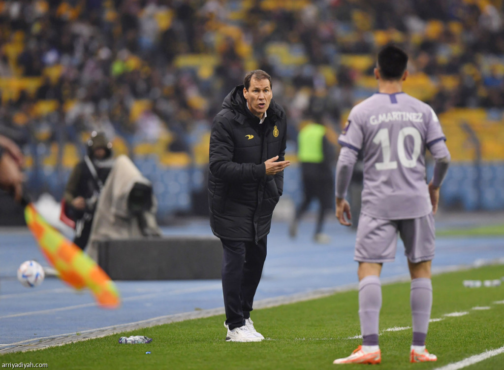 صورة التقطت أمس الأول للفرنسي جارسيا، مدرب فريق النصر، يوجه الأرجنتيني مارتينيز خلال مباراة الاتحاد تصوير: يزيد الضويحي
