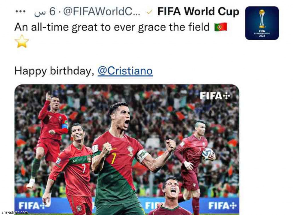 هنأ حساب كأس العالم الرسمي، عبر “تويتر”، أمس، البرتغالي كريستيانو رونالدو، مهاجم فريق النصر الأول لكرة القدم، بمناسبة يوم ميلاده الـ 38.
