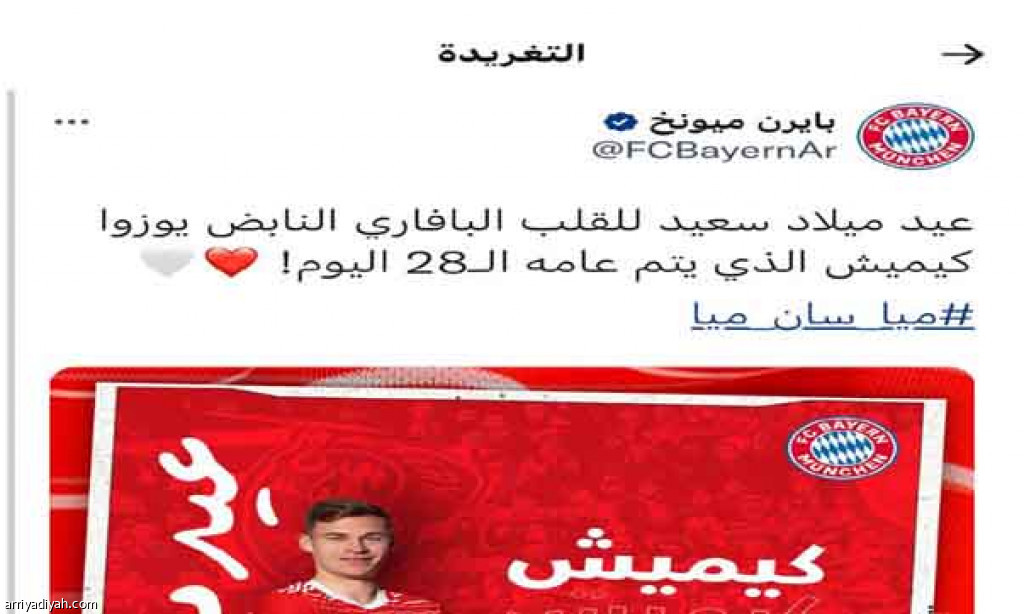 هنأ حساب نادي بايرن ميونيخ الرسمي، عبر “تويتر”، أمس، الألماني جوشوا كيميش مدافع الفريق الأول لكرة القدم بمناسبة ذكرى يوم ميلاده الـ28.