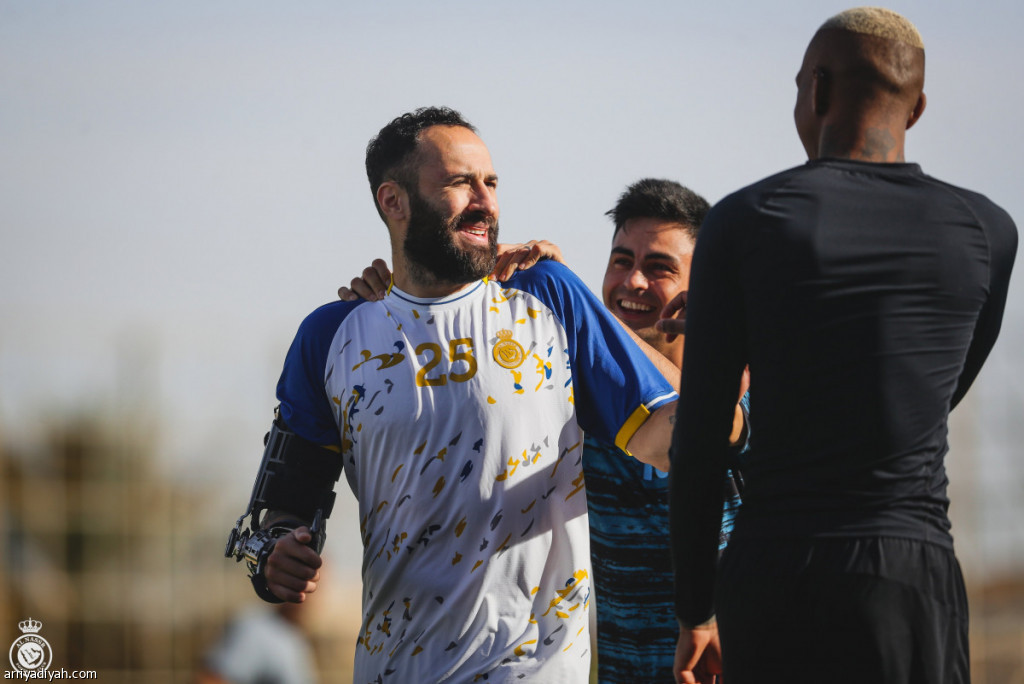 صورة التقطت أمس الأول للكولومبي دافيد أوسبينا، حارس فريق النصر الأول لكرة القدم”المبعد”، مرتديًا “Hinged elbow brace” مثبت المرفق خلال حضوره في النادي (المركز الإعلامي ـ النصر)