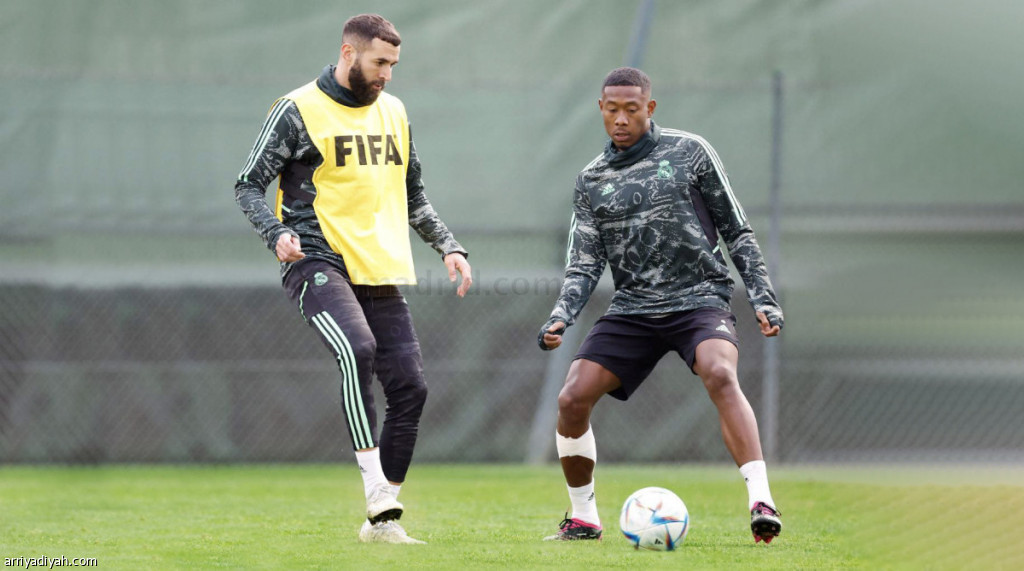 صورة التقطت أمس للفرنسي كريم بنزيمة، مهاجم فريق ريال مدريد الأول لكرة القدم، وزميله المدافع النمساوي دافيد ألابا في التدريب الأخير قبل ملاقاة الهلال اليوم في نهائي كأس العالم للأندية (المركز الإعلامي ـ ريال مدريد)