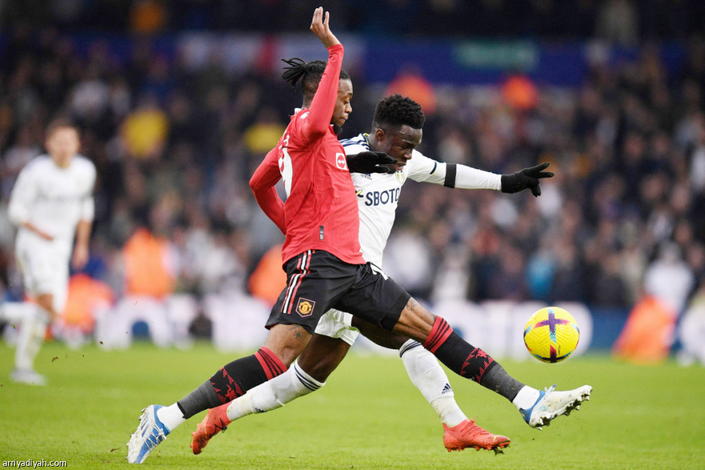صورة التقطت أمس لآرون وان بيساكا، مدافع فريق مانشستر يونايتد الإنجليزي الأول لكرة القدم، لحظة تنافسه على الكرة مع الإيطالي ويلفريد جنونتو، مهاجم فريق ليدز يونايتد، وذلك في اللقاء الذي جمع الفريقين ضمن منافسات الدوري الممتاز(الفرنسية)