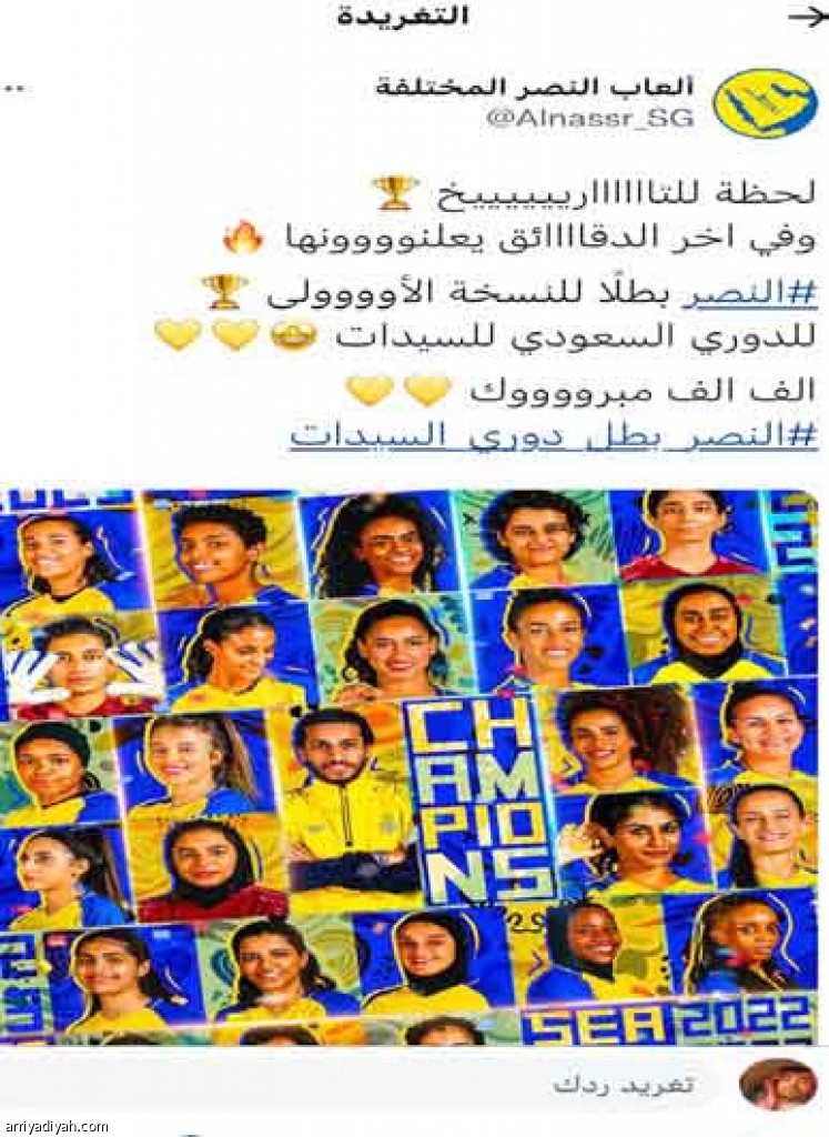 وجاءت غالبية الردود مباركة للأصفر، ومثنية على مستوى النسخة الأولى من الدوري، من بينهم تهاني، قائلة: “مبروك لسيدات العالمي تحقيق أول نسخة للدوري”، وعلى السياق ذاته، اتجهت نادية، التي أثنت على مستويات البطولة قائلة: “النصر بطل أول نسخة من دوري السيدات، بطولة نظمت بكشل ممتاز لنهضة المسابقات النسائية”. ولم يغبن لاعبات النصر عن الإطراء، إذ كتبت “النصراوية”: “فعلوها فتياتي”، وطالب نايف لاعبي النصر بتحقيق دوري روشن السعودي، قائلًا: “سيداتي آنساتي خذوا الدوري.. باقي سادتي”.