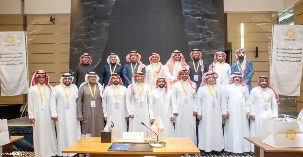 صورة التقطت أمس لطلال العبيدي رئيس رابطة دوري الدرجة الأولى للمحترفين متوسطًا الأعضاء عقب نهاية اجتماع الجمعية العمومية في الرياض (المركز الإعلامي ـ رابطة الأولى)