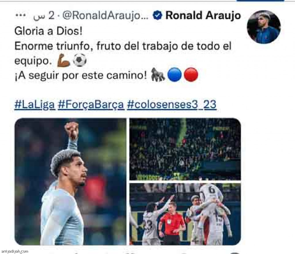 هنأ الأوروجوياني رونالد أراوخو، مدافع فريق برشلونة الأول لكرة القدم، عبر “تويتر”، أمس، مشعجي الفريق بمناسبة فوزهم على فياريال بهدف نظيف.
