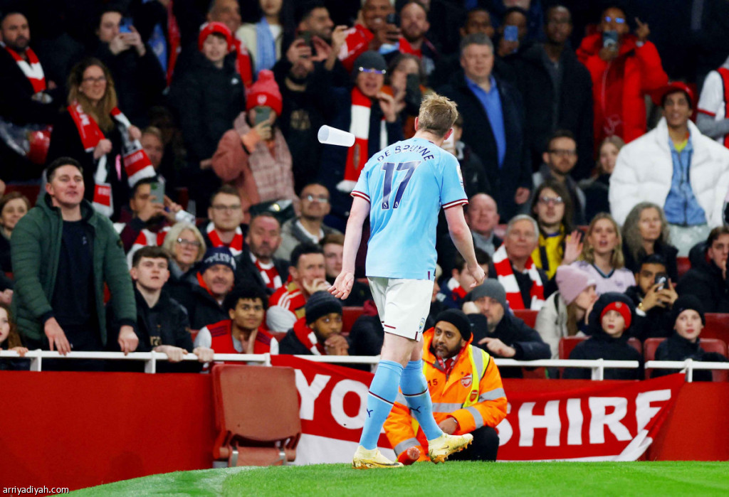 وكان دي بروين، الذي سجل هدف التقدم لفريقه “3ـ1”، احتك بالإسباني ميكيل أرتيتا، مدرب المدفعجية، خلال المباراة، وهو ما لم يعجب المشجعون. وبحسب صحيفة “ديلي ميل” الإنجليزية، أمس، فإن الاتحاد سيفرض عقوبات قاسية بحق أي مشجع وجد مذنبًا بإلقاء الزجاجات على دي بروين.