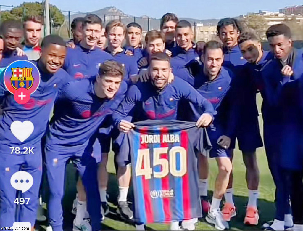 شارك حساب نادي برشلونة الإسباني، عبر منصة “تيك توك”، أمس، متابعيه باحتفاء اللاعبين بالإسباني جوردي ألبا، لاعب الفريق الأول لكرة القدم، بعد خوضه 450 مباراة.