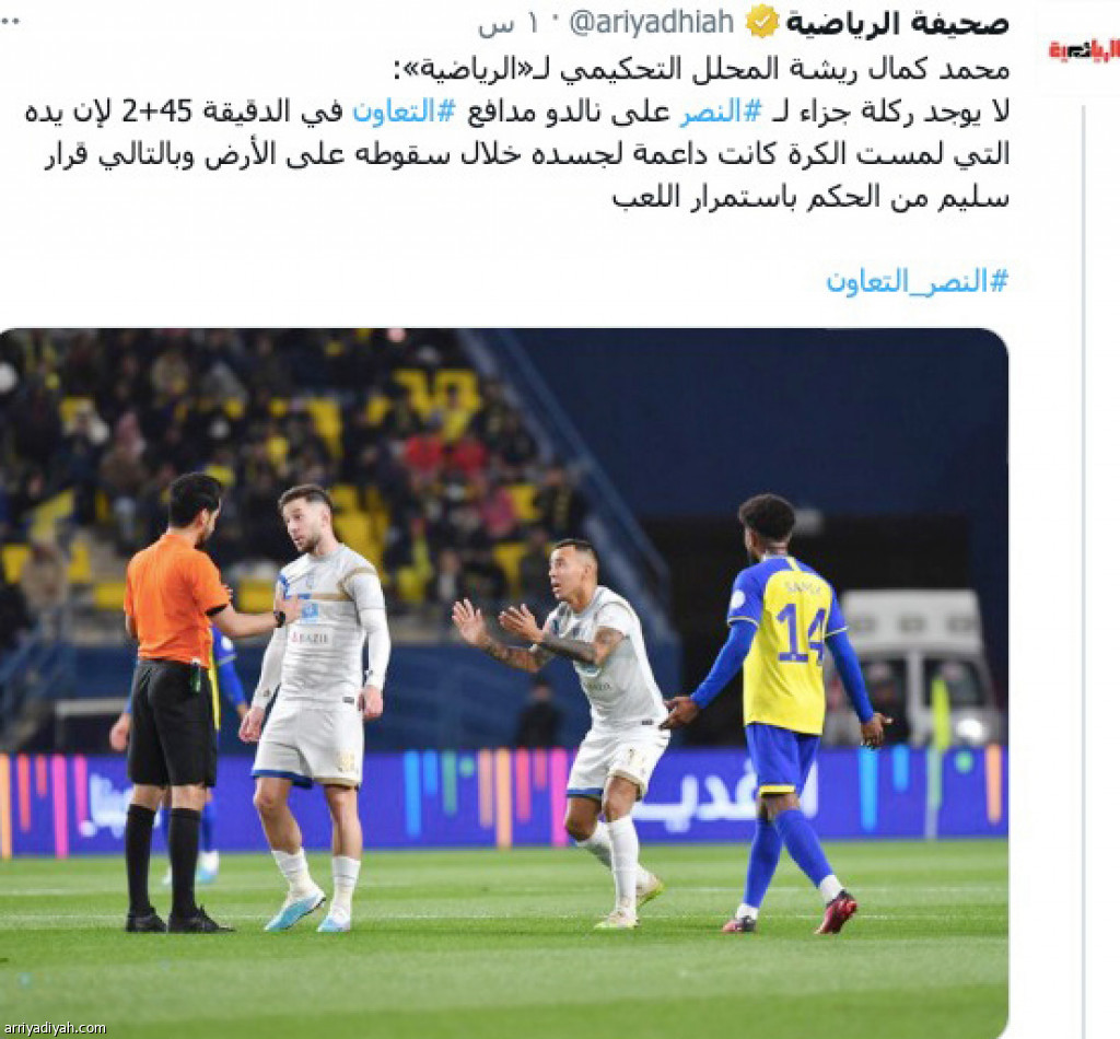 ونالت تغريدات حساب “الرياضية”، التي نشرها على لسان محمد ريشة، المحلل التحكيمي لها، أكثر من 120 ألف تفاعل، بعد أن أكد صحة قرار الحكم بعدم احتساب ركلة جزاء للنصر على التعاون وصحة احتساب هدف النصر الثاني.