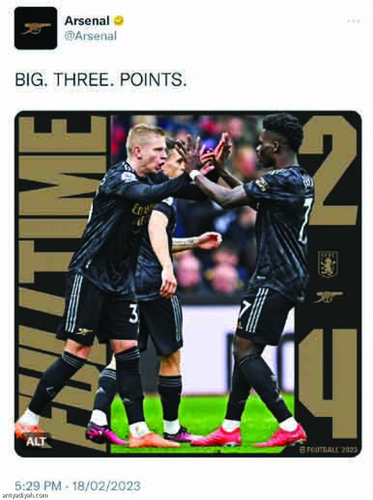حصدت تغريدة حساب نادي أرسنال الإنجليزي، أمس على منصة تويتر، بعد انتصار الفريق الأول لكرة القدم على منافسه أستون فيلا بنتيجة 4ـ2 ضمن منافسات الدوري الإنجليزي، أكثر من 1.3 مليون ظهور خلال ساعة واحدة من نشرها.
