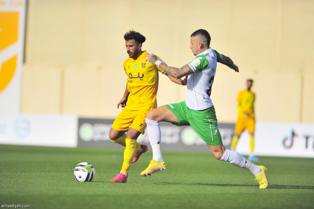 صورة التقطت أمس لباسل السيالي، لاعب وسط الحزم، يحاول المرور من البرازيلي جوبسون سوزا، لاعب الخلود، خلال مباراة الفريقين (المركز الإعلامي - الحزم)