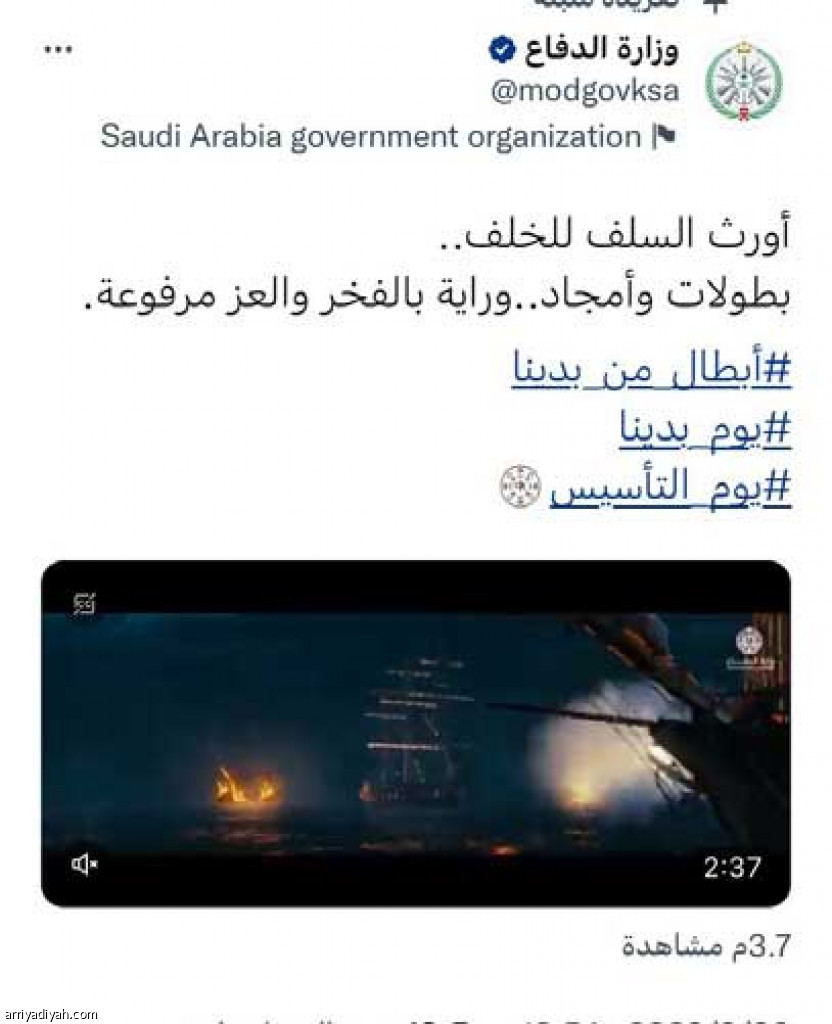 نالت تغريدة حساب وزارة الدفاع، التي استذكرت فيها المعارك الخالدة في التاريخ السعودي، وانتهت بتأسيس السعودية، تفاعلًا قياسيًّا في موقع التدوينات القصيرة “تويتر”، إذ حصدت 18.8 مليون مشاهدة، مقابل 3.6 متابعة لمقطع الفيديو، و262 ردًّا، و1.4 ألف إعادة تغريد، و4.5 ألف إعجاب.