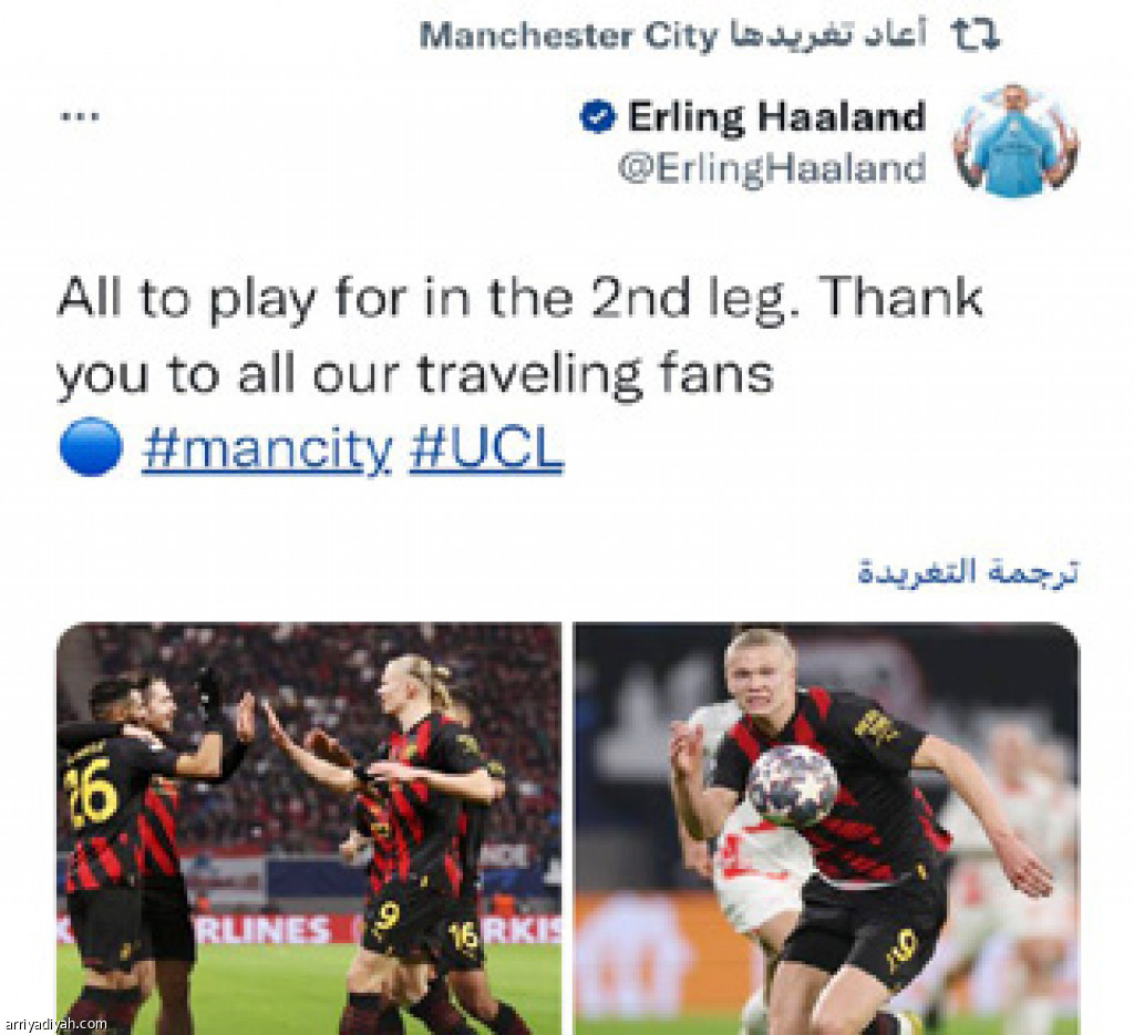 سيطرت تغريدة النرويجي إيرلينج هالاند، مهاجم فريق مانشستر سيتي الأول لكرة القدم، بعد تعادلهم 1ـ1 أمام لايبزيج، ضمن مباريات دور الـ16 من دوري أبطال أوروبا، على اهتمامات مستخدمي موقع التدوينات القصيرة “تويتر” خلال الـ24 ساعة الماضية. وطالبت جماهير السيتي من اللاعب بذل مجهود أكبر في مباراة الإياب. ونالت التدوينة تفاعلًا قياسيًا بحصدها 957 ردًا و2.2 ألف إعادة تغريد و52 ألف تفضيل و1.7 مليون مشاهدة خلال 15 ساعة من نشرها.
