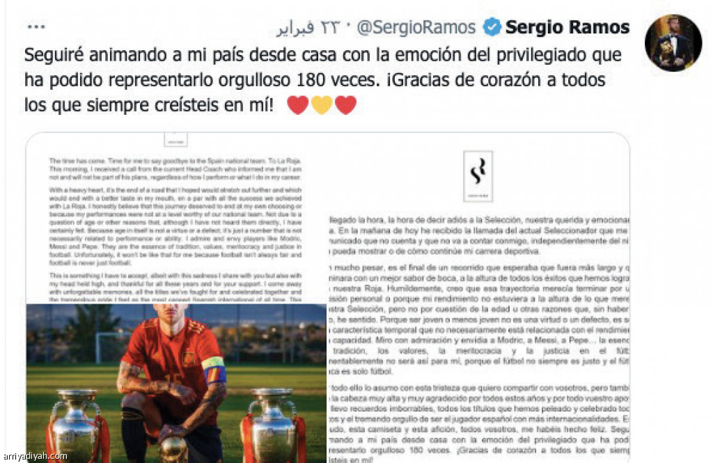 وكتب راموس، عبر حسابه الشخصي على “تويتر”: “سأستمر في تشجيع بلدي من المنزل بعاطفة الشخص المتميز، الذي استطاع بفخر تمثيله 180 مرة، أشكركم من أعماق قلبي لكم جميعًا الذين آمنوا بي دائمًا”، وتفاعل أكثر من 12 مليون مغرد مع تغريدة راموس، التي برزت فيها نغمة الحزن.