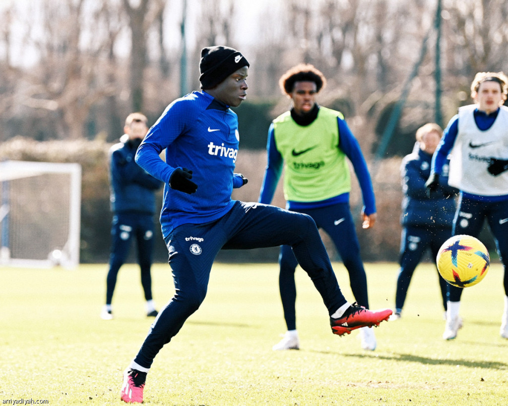 صورة التقطت أمس لنجولو كانتي، لاعب الوسط، يشارك في الحصة التدريبية لفريق تشيلسي للمرة الأولى منذ أغسطس الماضي بعد تعافيه من الإصابة (المركز الإعلامي - تشيلسي)