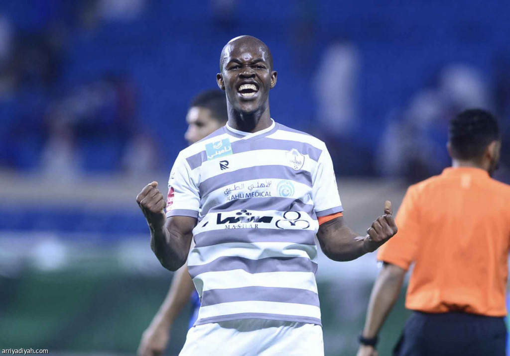 صورة التقطت أمس للزيمبابوي نوليدج موسونا، مهاجم فريق الطائي الأول لكرة القدم، يحتفل عقب تسجيله الهدف الثالث وفوز فريقه أمام الفتحتصوير: محمد الدويسان