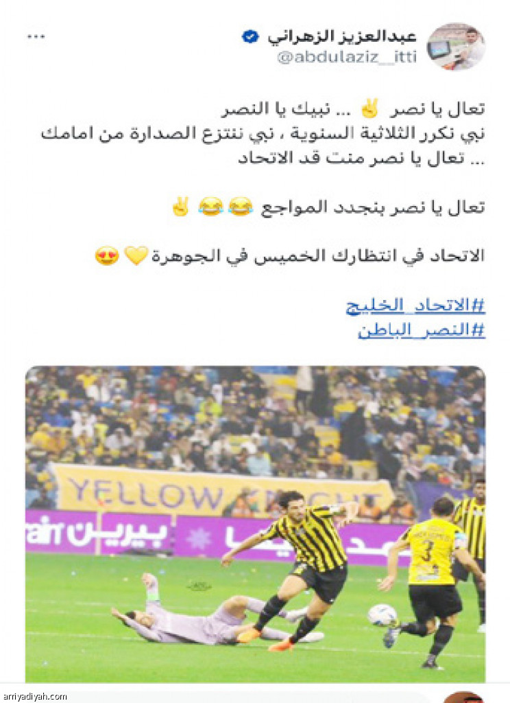 اعتلت نبرة التحدي من جماهير الاتحاد، أمس، لنظيرتها النصراوية في موقع التدوينات القصيرة “تويتر” قبل الكلاسيكو، الخميس المقبل، بعدما كسب فريقها ضيفهم الخليج بثلاثية نظيفة، أمس، ضمن مباريات الجولة الـ 19 من دوري روشن السعودي.