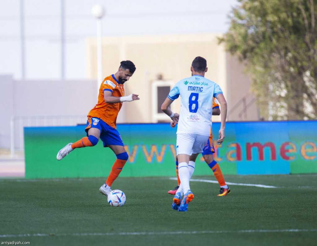 صورة التقطت الخميس الماضي لأسامة الخلف، ظهير أيمن فريق الفيحاء الأول لكرة القدم، يمرر الكرة أثناء لقاء أبها تصوير: سعد الدوسري