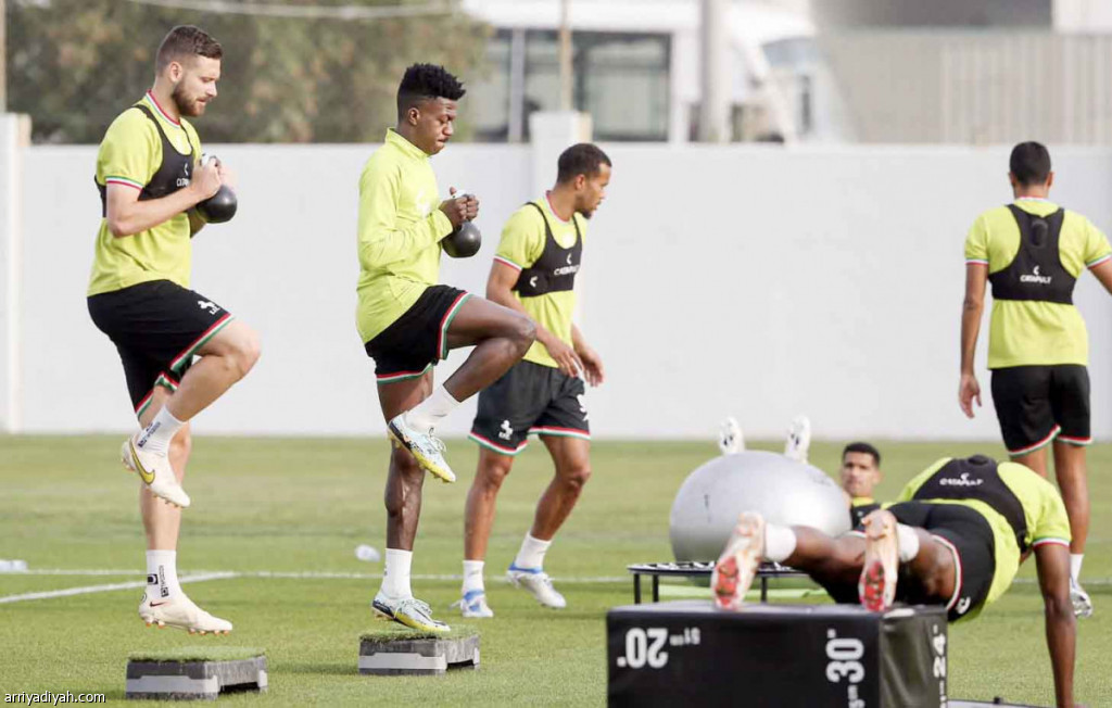صورة التقطت أمس للمقدوني الشمالي داركو فيلكوفسكي، مدافع الاتفاق، أثناء انخراطه برفقة زميليه عبد الله الخطيب والسويدي روبن كوايسون وآخرين في تدريبات التقوية(المركز الإعلامي ـ الاتفاق)