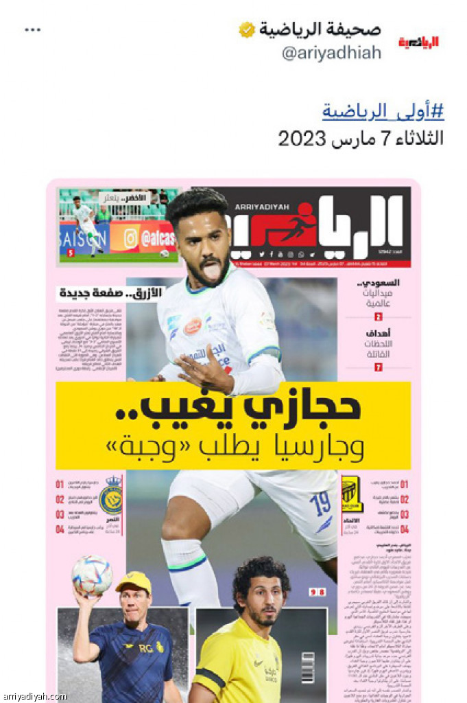 استحوذ خبر صحيفة “الرياضية” حول احتمالية غياب المصري أحمد حجازي، مدافع فريق الاتحاد الأول لكرة القدم، عن مواجهة الكلاسيكو أمام النصر، على اهتمامات مستخدمي موقع التواصل الاجتماعي “تويتر”، أمس.
