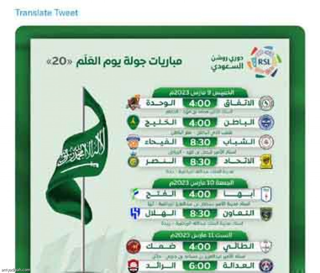 عرض حساب دوري روشن السعودي عبر منصة “تويتر”، أمس، جدول مواجهات الجولة الـ 20 “جولة يوم العلم”. وحصدت التغريدة صدى واسعًا وصل إلى أكثر من 100 ألف تفاعل خلال 4 ساعات من بثها، وأكثر من 44 ردًا جاءت غالبيتها من الجماهير الاتحادية والنصراوية قبل قمة الجولة اليوم.