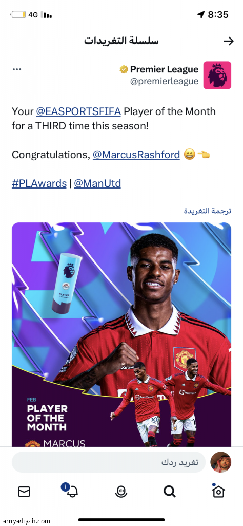 نالت تدوينة حساب الدوري الإنجليزي، على موقع التدوينات القصيرة “تويتر”، التي أعلنت حصول الإنجليزي ماركوس راشفورد، مهاجم فريق مانشيستر يونايتد الأول لكرة القدم، على جائزة لاعب شهر فبراير، تفاعلًا قياسيًا بحصدها 2.4 مليون مشاهدة للتغريدة، و471 ردًا، و7 آلاف إعادة تغريد، و38 ألف إعجاب خلال 5 ساعات. وجاءت غالبية الردود مثنية على الاختيار، عادة أن الهداف الإنجليزي يستحق الجائزة من بينهم ويندر: “جائزة عن جدارة لراشفورد”.