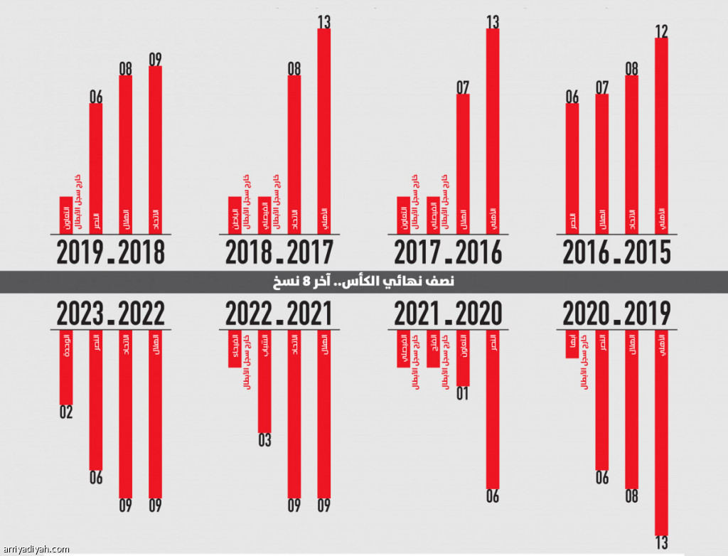 ويحتل النصر، بـ 6 ألقاب، المركز الثالث في السجل، ويعود تتويجه الأخير بالبطولة إلى 1990، عام توقفها الذي استغرق 18 عامًا. فيما حققها الوحدة، رابع أضلاع نصف النهائي، مرتين، آخرهما عام 1966، تجعلانه الخامس في ترتيب أبطالها، بالتساوي مع الاتفاق. وبعكس النصر والوحدة، حصد الهلال والاتحاد اللقب قبل وبعد التوقف المؤقت. وآخر نسخةٍ سابقةٍ جمعت 4 أبطالٍ للكأس في دور الأربعة كانت خلال موسم 2015ـ2016، عندما صعد الهلال والاتحاد والنصر إلى ذلك الدور، في أبريل 2016 قبل نحو 7 أعوام، برفقة الأهلي، البطل التاريخي.