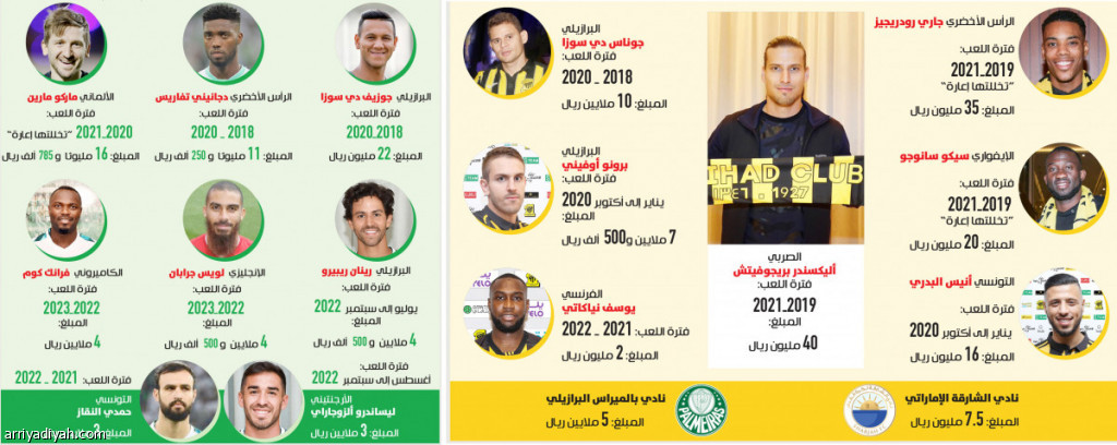 ويطالب الصربي أليكسندر بريجوفيتش بالمبلغ الأكبر، يليه الرأس الأخضري جاري رودريجيز، والإيفواري سيكو سانوجو، والتونسي أنيس البدري، والبرازيلي جوناس دي سوزا، ومواطنه برونو أوفيني، والفرنسي يوسف نياكاتي على الترتيب. وثمة قضية ثامنة لا تخص لاعبًا وإنما ناديًا وهو الشارقة الإمارتي الذي اختصم الاتحاد في المحكمة الدولية ذاتها على خلفية تأخر تسلمه بقية مستحقات صفقة انتقال البرازيلي إيجور كورونادو للنمور صيف 2021. ولا تزال القضية قيد النظر بعدما قدّمت إدارة النادي الغربي استئنافًا على الحكم الصادر بأحقية الشارقة في مليوني دولار. وبعيدًا عن ساحات القضاء، تضيف مستحقات متأخرة لنادي بالميراس البرازيلي 5 ملايين ريال أخرى إلى ديون الاتحاد خارجيًا. وتمثّل تلك المستحقات دفعتين متبقيتين من قيمة صفقة انتقال البرازيلي برونو هنريكي، لاعب الوسط، إلى بطل السوبر السعودي.